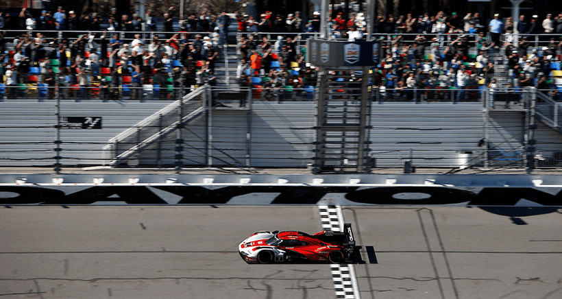 Felipe Nasr crosses the finishing line 24 hours after the green flag was waved in front of the remaining 41 cars that were able to finish this year’s Daytona 24.
