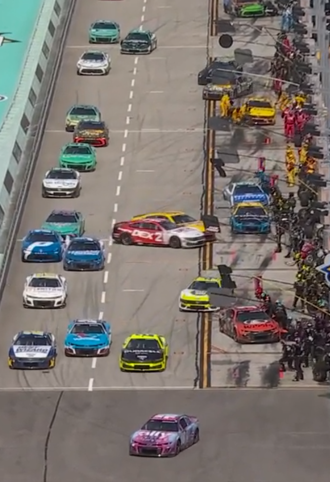 The whole field pitted under caution, led to green by Wallace, Larson, Hamlin, Bowman and Reddick with 50 to go. Heavy hitters Byron and Cindric ended up being penalised for speeding on pit road.