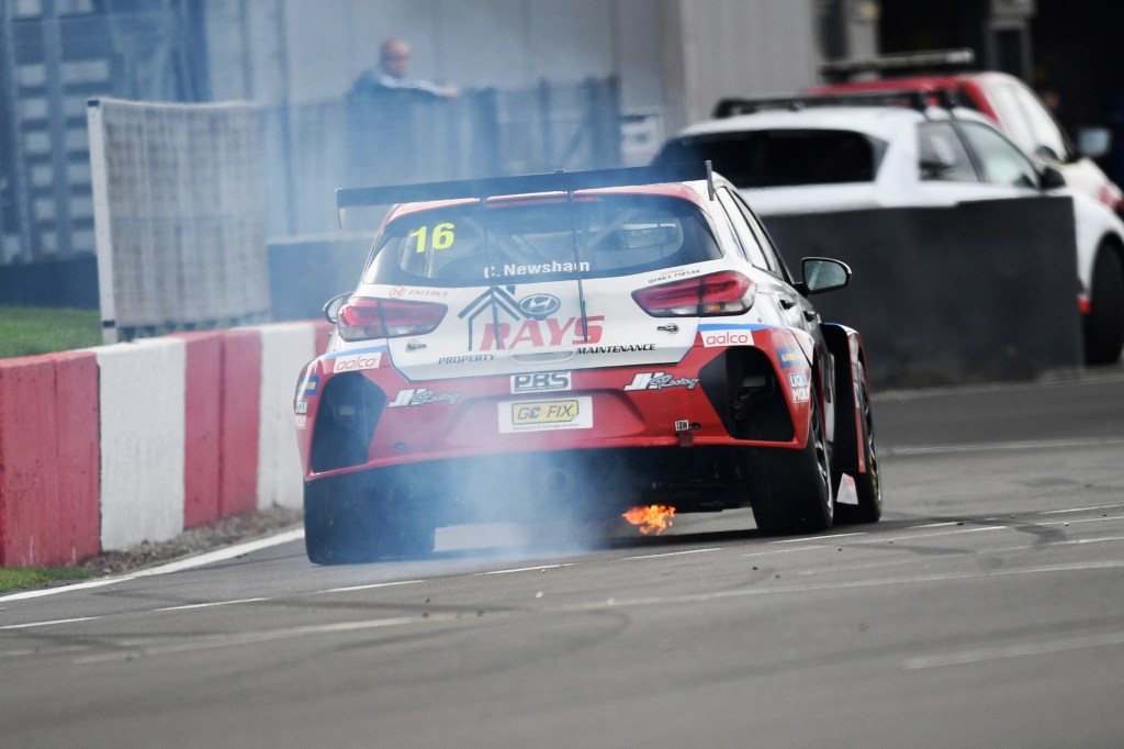 Callum Newsham was in second place, flying the flag for the Hyundai i30Ns, but he had an issue on the first full lap of racing. Smoke billowed under the front of his car, accompanied by a vicious orange glow like your younger sister stepping out with a fresh spray tan.